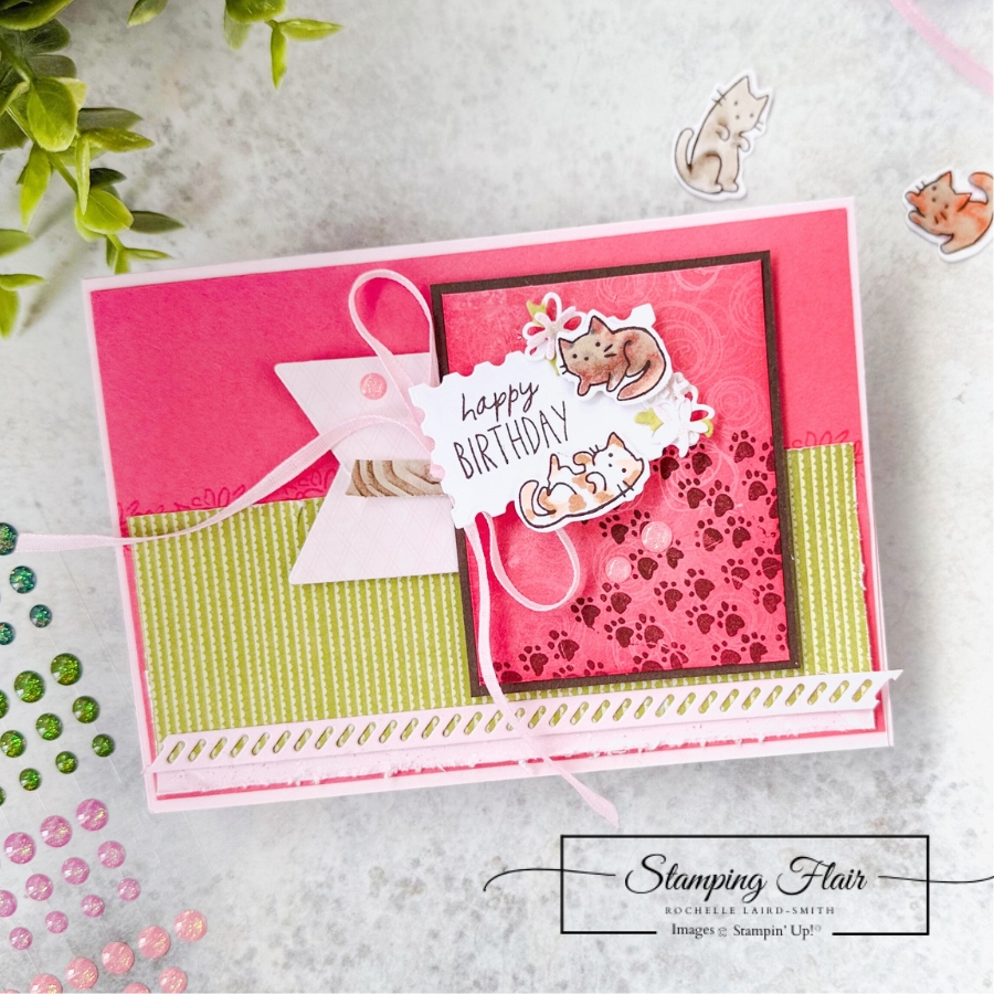The cats were coloured in a mix of Stampin’ Blends. Where there were multiple colours, I used the Colour Lifter to diffuse the edges, creating a softer edge. An angled sentiment adds to the playfulness of this card with the kitties frolicking among the flowers.